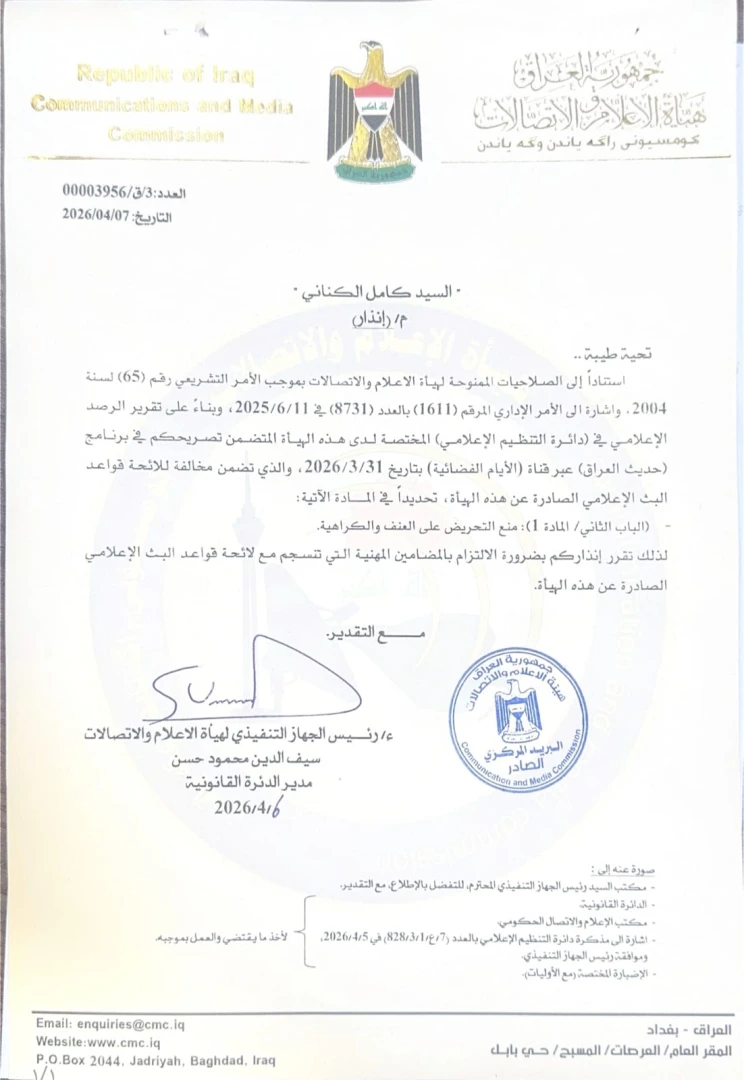 وجّهت هيئة الإعلام والاتصالات العراقية، يوم الثلاثاء، إنذاراً إلى المحلل السياسي كامل الكناني بسبب "مخالفة" لائحة قواعد البث الإعلامي.