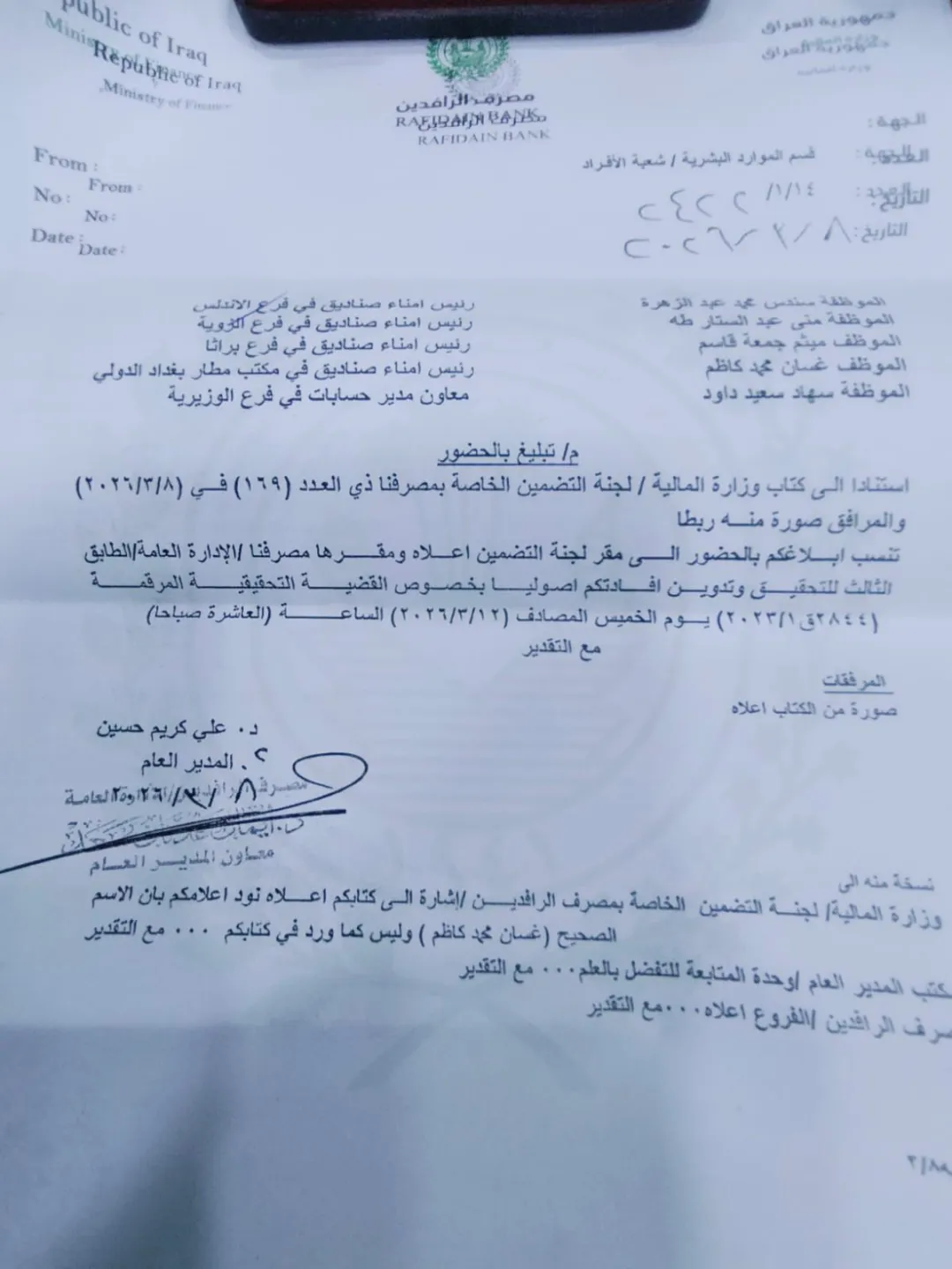 وأظهرت وثائق صادرة عن المصرف الحكومي أنه، استناداً إلى كتاب وزارة المالية / لجنة التضمين الخاصة بمصرف الرافدين بالعدد (629) في 18 شباط / فبراير 2025، جرى توجيه دعوات رسمية إلى المتهمين للحضور إلى مقر لجنة التضمين في المصرف للتحقيق معهم وتدوين أقوالهم بشأن المخالفات المنسوبة إليهم.