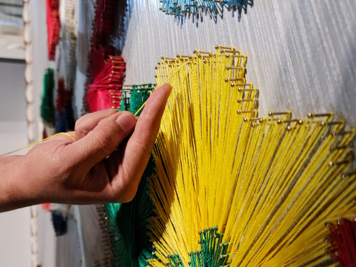 وفيما يخص الأدوات التي يستخدمها في لوحاته، يذكر هويدي، أن "أهم الخيوط هي الملونة، وتسمى محليا (فنطازي)"، مشيرا إلى وجود صعوبة في الحصول على المسامير والخيوط، مبينا أن "هذا الفن يتطلب مسامير وخيوط مميزة تظهر ملامح الرسمة".