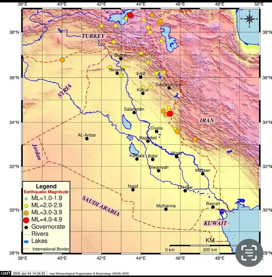 أصدر قسم الرصد الزلزالي في الهيئة العامة للأنواء الجوية العراقية، يوم الأحد، التقرير الشهري الخاص بالنشرة الزلزالية وخارطة النشاط الزلزالي في العراق والمناطق المجاورة لشهر كانون الأول / ديسمبر 2025.