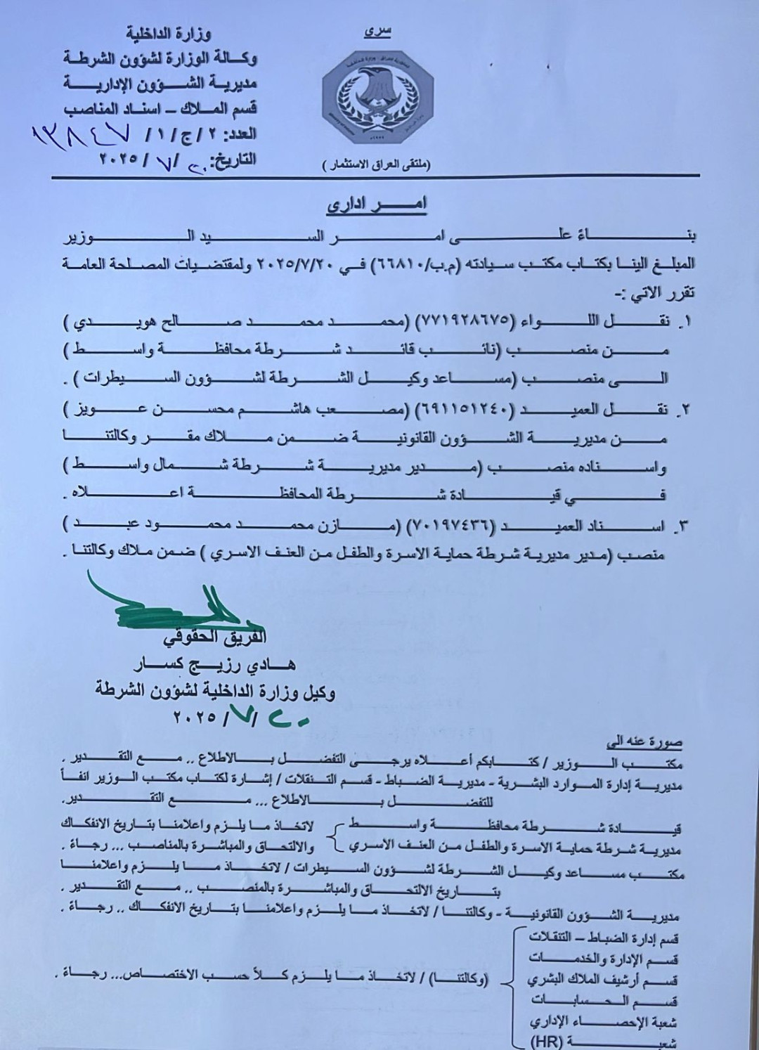 وشمل القرار أيضاً إسناد العميد مازن محمد محمود منصب مدير مديرية شرطة حماية الأسرة والطفل من العنف الأسري، ضمن ملاكات وكالة وزارة الداخلية.