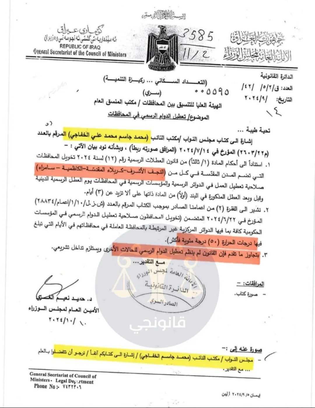 وارفق الخفاجي بيانه، بوثيقة صادرة عن الأمانة العامة لمجلس الوزراء تظهر، أن قانون العطلات الرسمية رقم (12) لسنة 2024 يخول المحافظين صلاحية تعطيل الدوام في المدن المقدسة مثل النجف وكربلاء والكاظمية وسامراء في أيام العطل الدينية فقط ولمدة لا تزيد على ثلاثة أيام، كما يجيز تعطيل الدوام عند بلوغ درجات الحرارة (50) مئوية فأكثر، مؤكدة أن ما يتجاوز تلك الحالات يتطلب تدخلاً تشريعياً.