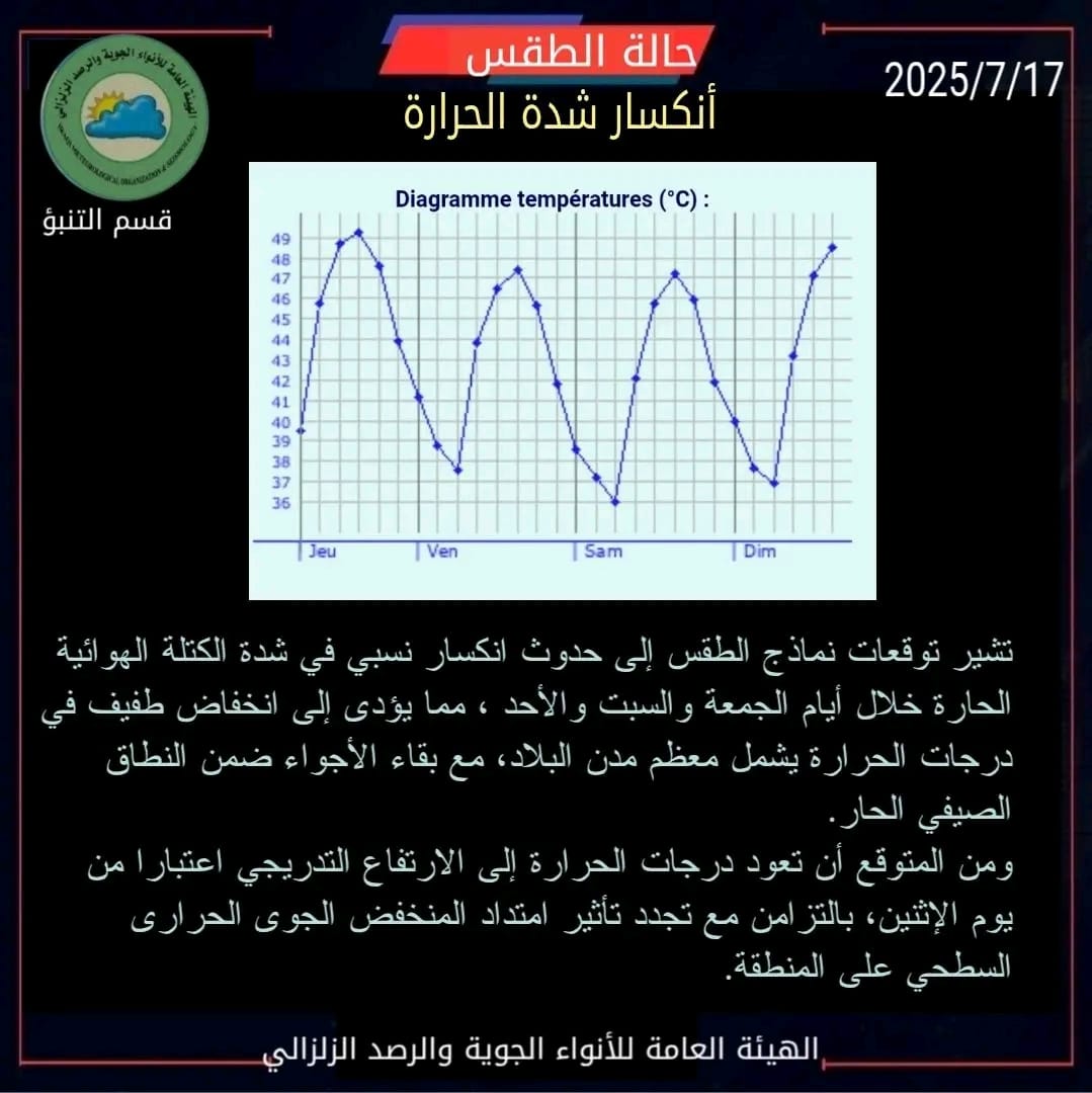 أعلنت هيئة الأنواء الجوية العراقية، اليوم الخميس، عن توقعات بانخفاض طفيف ومؤقت في درجات الحرارة خلال عطلة نهاية الأسبوع، يشمل معظم مدن البلاد، مع بقاء الأجواء ضمن نطاق الطقس الصيفي الحار.