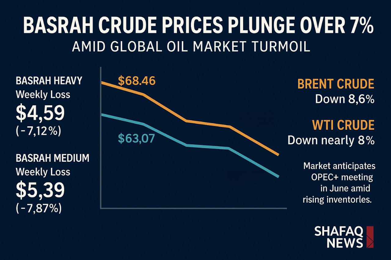 Basrah Heavy crude fell 7.12% to $59.92 per barrel, while Basrah Medium dropped 7.87% to $63.07.