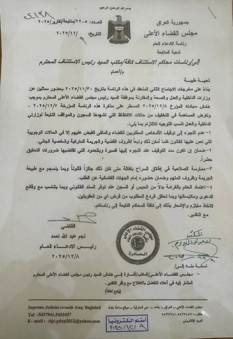 Iraq’s Supreme Judicial Council has directed courts nationwide to reduce the use of detention and imprisonment and to rely on legal alternatives where possible, to ease chronic overcrowding in prisons and detention facilities.