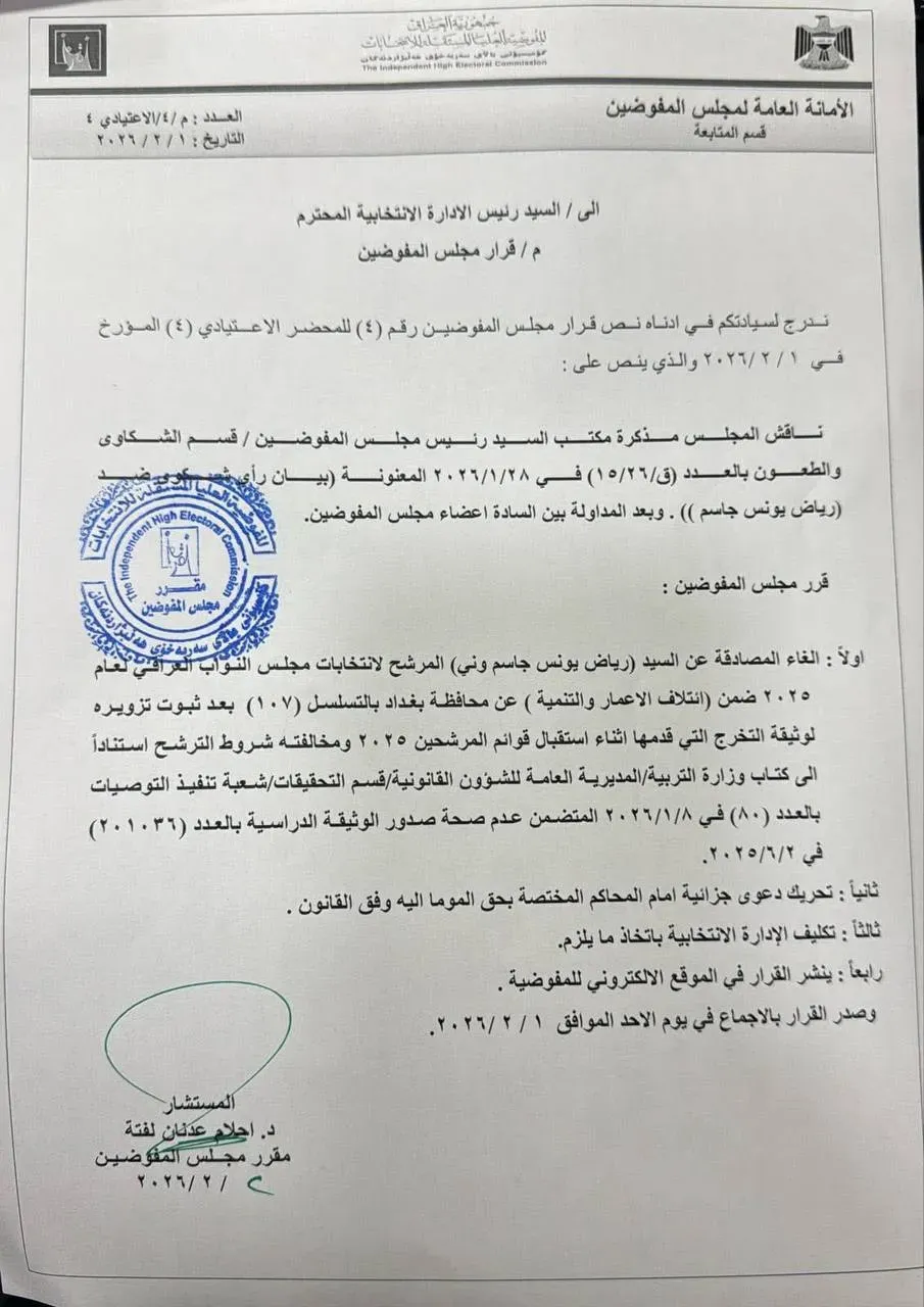 The document, issued by the IHEC’s Board of Commissioners and based on official correspondence from the Ministry of Education, showed that the graduation document submitted as part of the candidacy requirements could not be verified and did not meet eligibility conditions.
