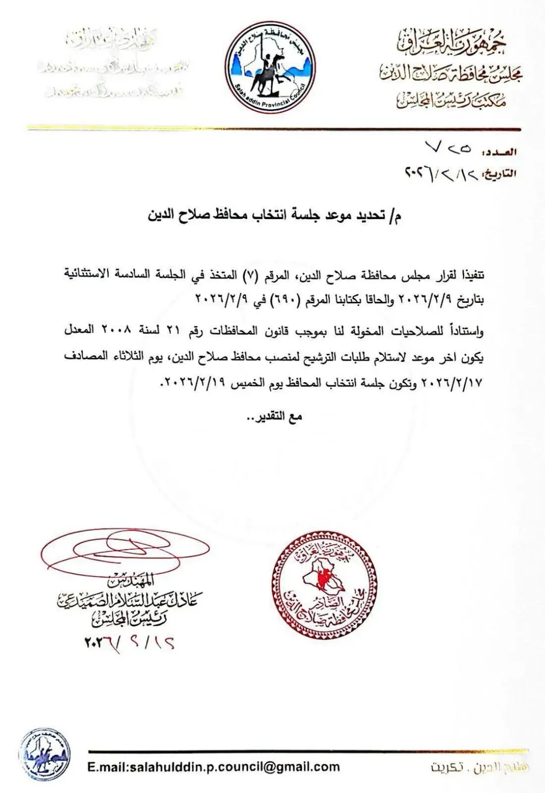 Iraq’s Saladin Provincial Council has set February 19 to elect a new governor for the north-central province, following the legal procedures governing nominations and voting, according to an official document.