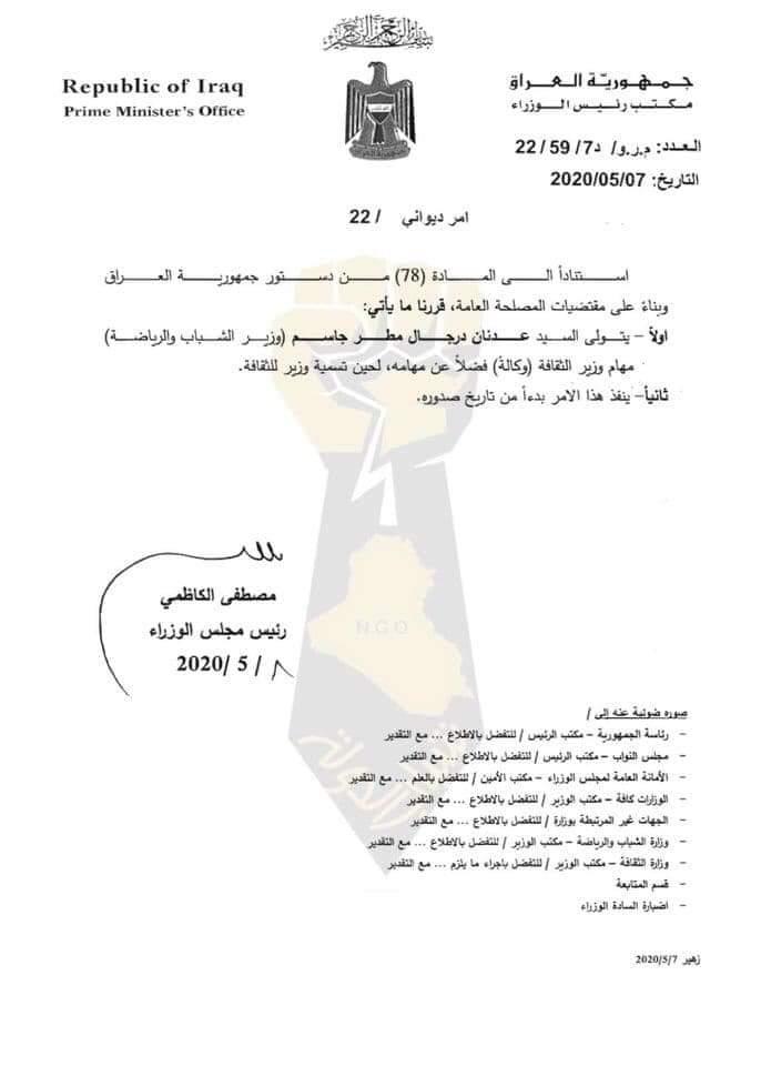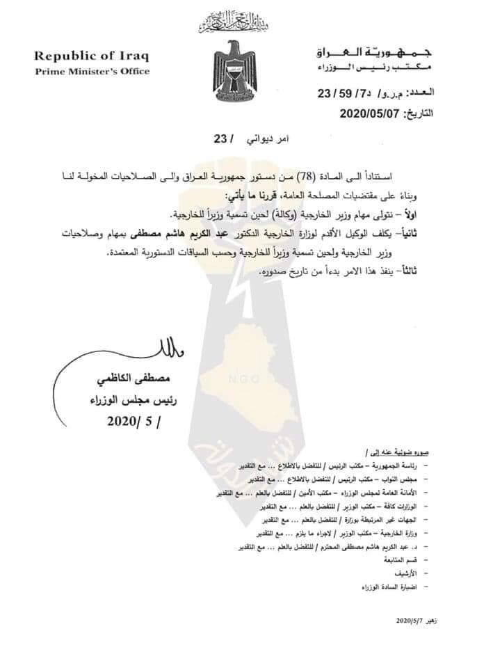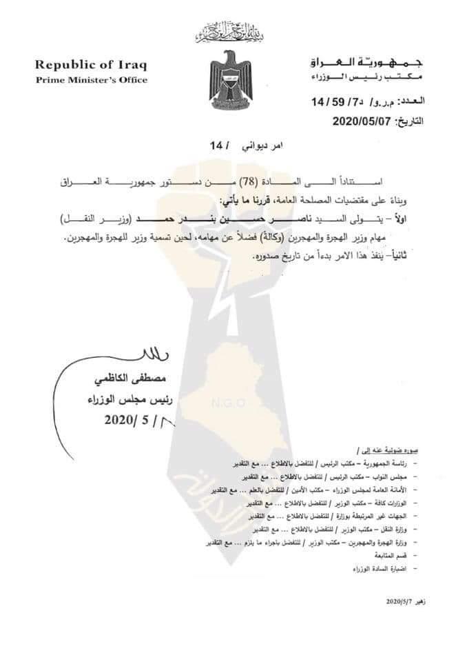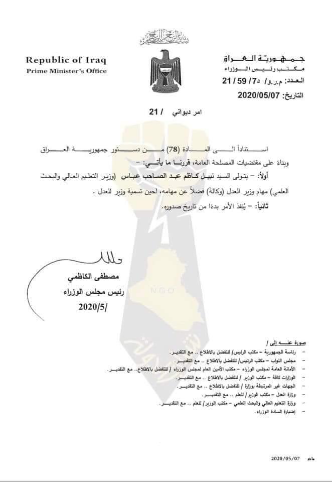 Shafaq News / Prime Minister (PM) Mustafa Al-Kadhimi issued bureau orders on Tuesday that entrust current ministers with the duties of vacant portfolios.