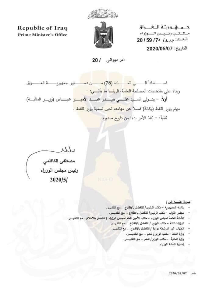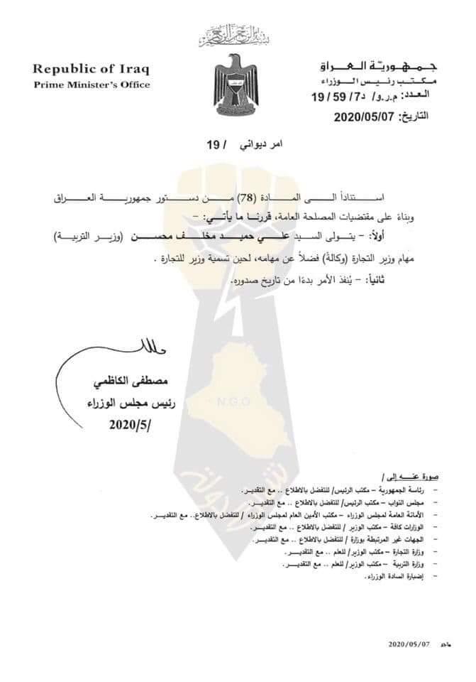 Among these orders is to assign the Minister of Education with the missions of the Minister of Justice , the Minister of Finance as the Minister of Oil , the Minister of Youth and Sports as the Minister of Culture , the Minister of Education as the Minister of Trade and the Minister of Transport as the Minister of Immigration and Displacement.