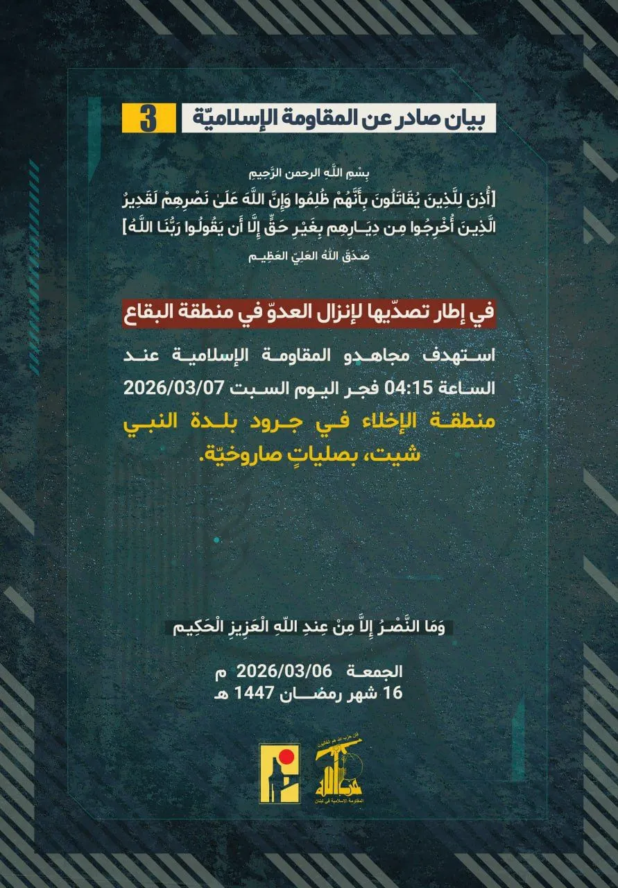 Lebanese Hezbollah confronted an Israeli landing force that reached the town of Nabi Chit in Lebanon’s eastern Beqaa Valley, a statement by the party said on Saturday, adding that intense clashes took place before the attacking force withdrew undera barrage of rocket fire.