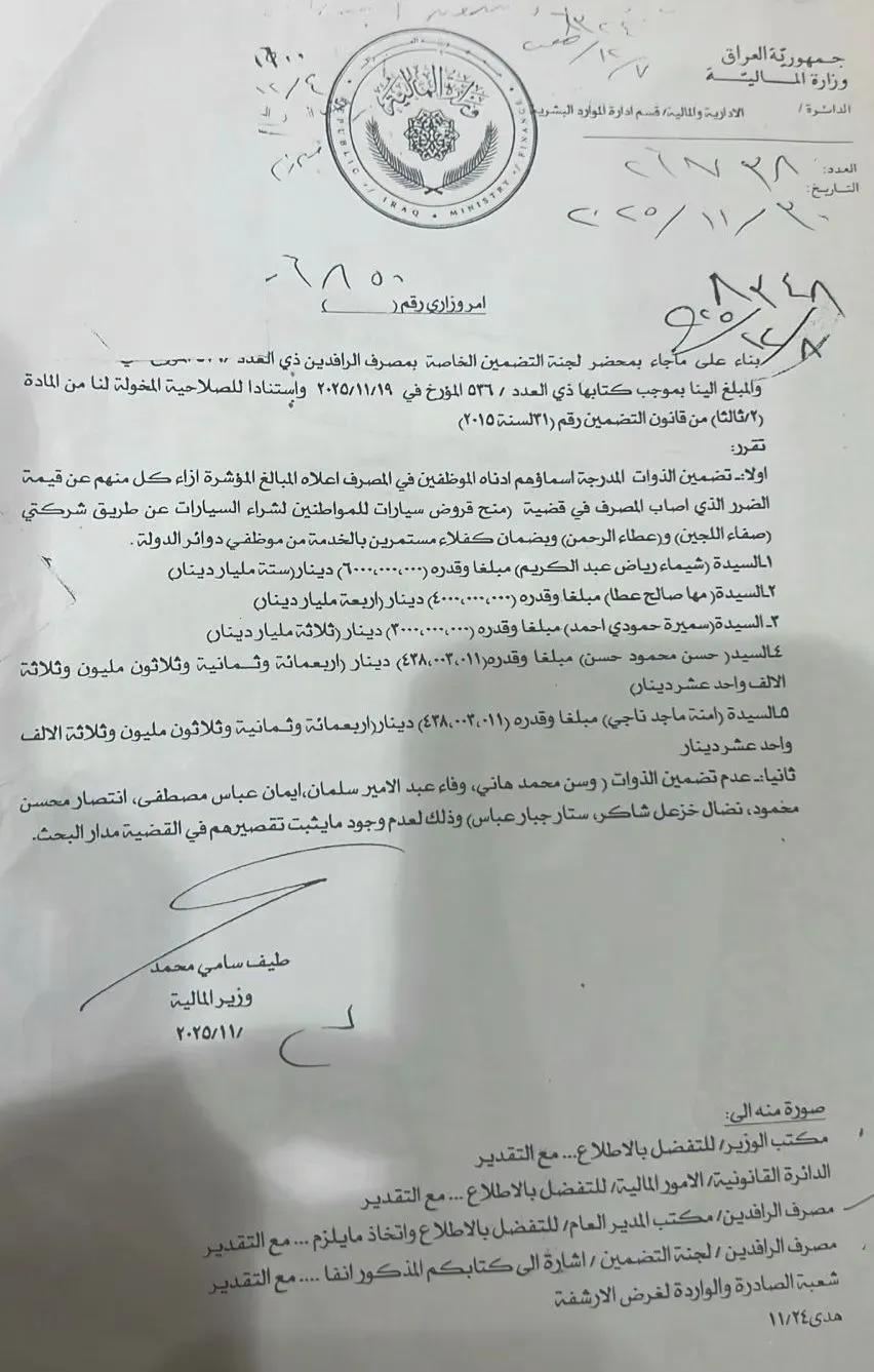 According to the documents, which include official correspondence issued by Iraq’s Ministry of Finance and addressed to Rafidain Bank, several employees were implicated in corruption cases, most notably involving the manipulation of monthly loan installments paid in cash by borrowers, where collected amounts were found to be missing and not matched by corresponding deposits in official banking records.