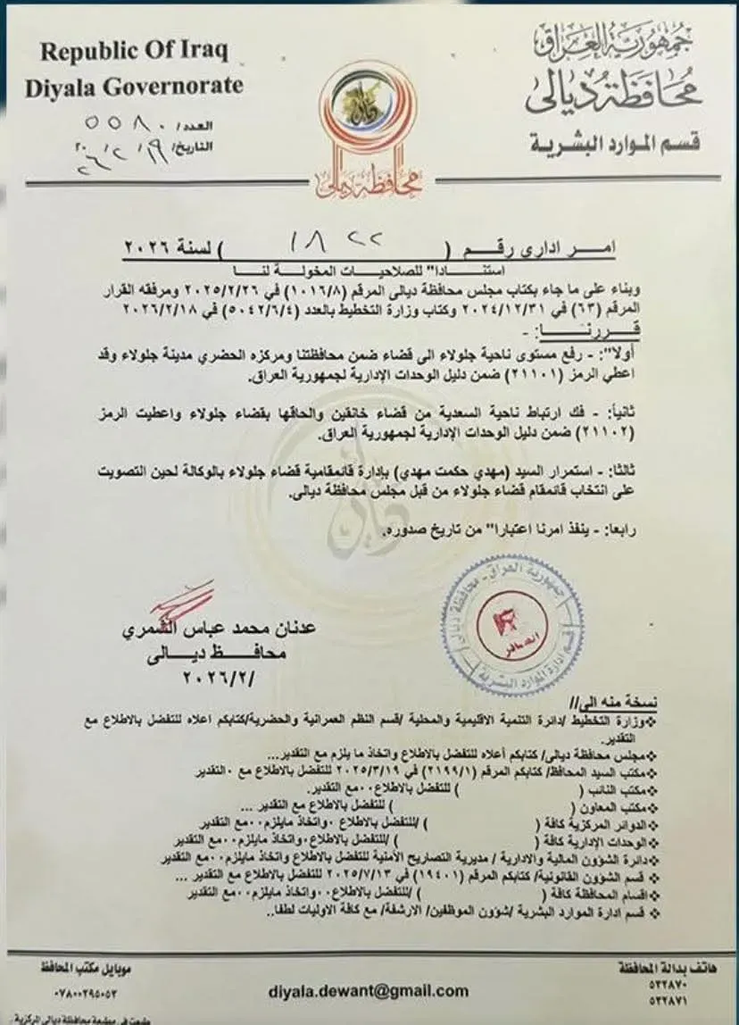 An official document confirmed the establishment of Jalawla district, with the current subdistrict director tasked with overseeing administration until a district commissioner is appointed. The decision also makes Al-Sadiyah the fourth area separated from Khanaqin after Jalawla, Tikaf, and Al-Mila.